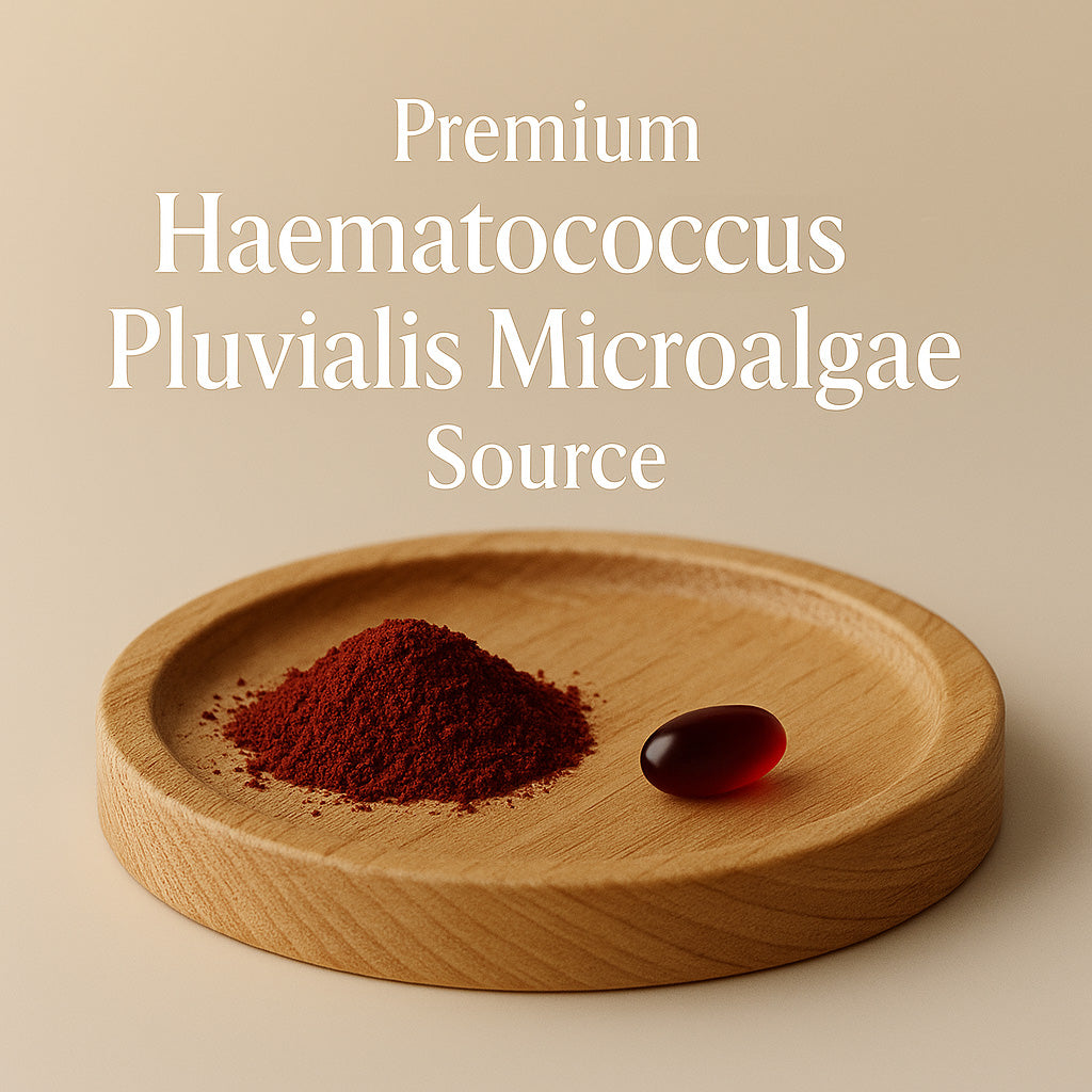 Astaxanthin 12 mg, sourced from Haematococcus pluvialis microalgae — the most researched and bioavailable natural form.